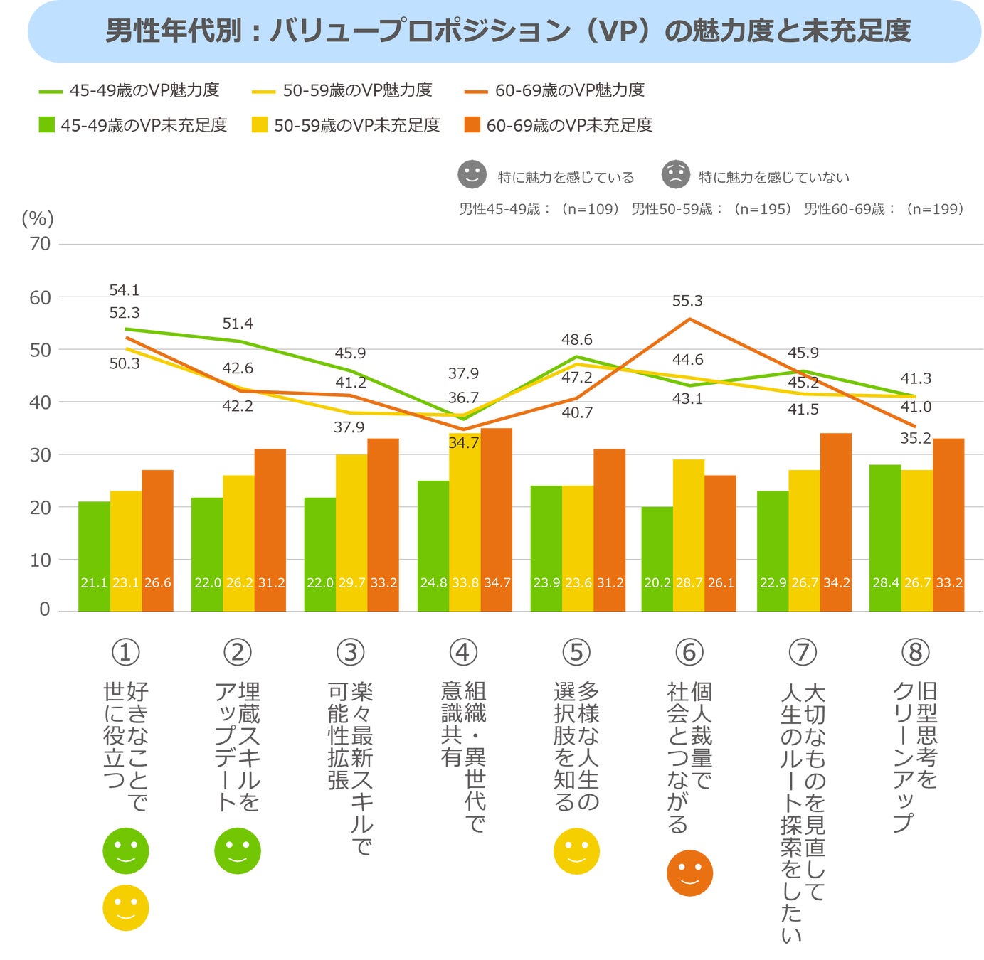 一方、女性は、男性に比べて組織への所属への関心は低く、45-49歳は「キャリアと家庭の両立」を重視し、50-59歳は「スキル習得への強い意識」を持つことが分かりました。60歳以降の「社会とのつながり」を見据え、組織の内外を問わずに活躍できるキャリアや人生設計を叶えられる学びを行うことで、自分らしく社会とつながることができるようになります。