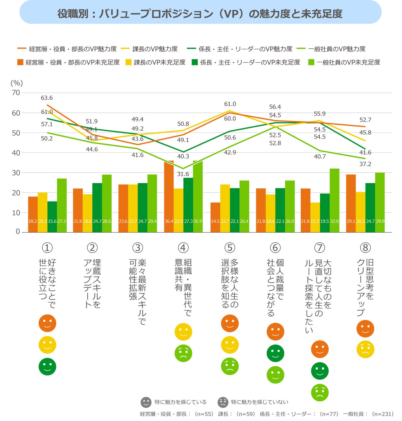 ● 役職が高いほど学びに感じる魅力は高いが、現場に近いポジションのミドル・シニア層では学びに感じる魅力は低い傾向。-③