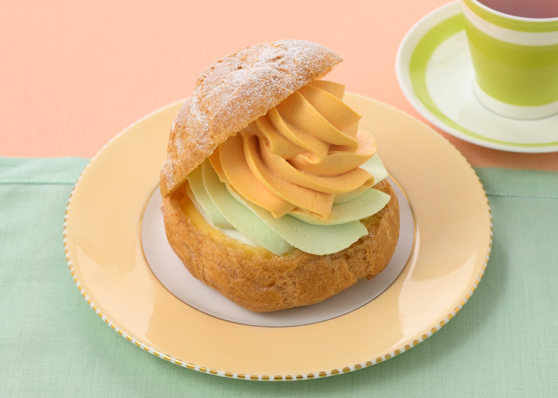 特長:赤肉メロンのピューレを使った赤肉メロンクリーム、青肉メロン風クリーム、まろやかカスタードを、さっくり焼き上げたシュー皮にとじこめました。