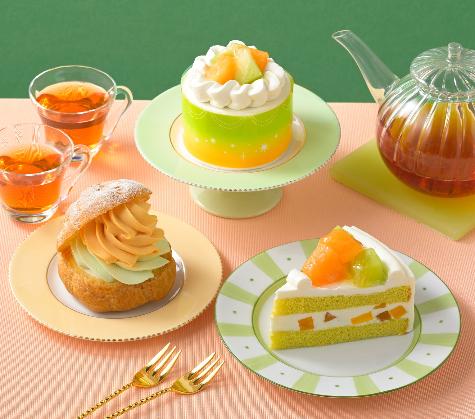 ショートケーキとミルクレープ、コージープリンセスには一口サイズの2種のメロンをゴロゴロッとトッピング。お祝いの席や家族の集まりの場にぴったりなデコレーションケーキには、大振りのメロンを贅沢に飾りました。いつものおやつにちょうどいいシュークリームは、2種メロンの味わいのクリームとカスタードが相性抜群。さまざまなシーンやお好みに合わせて楽しめるケーキのラインアップです。