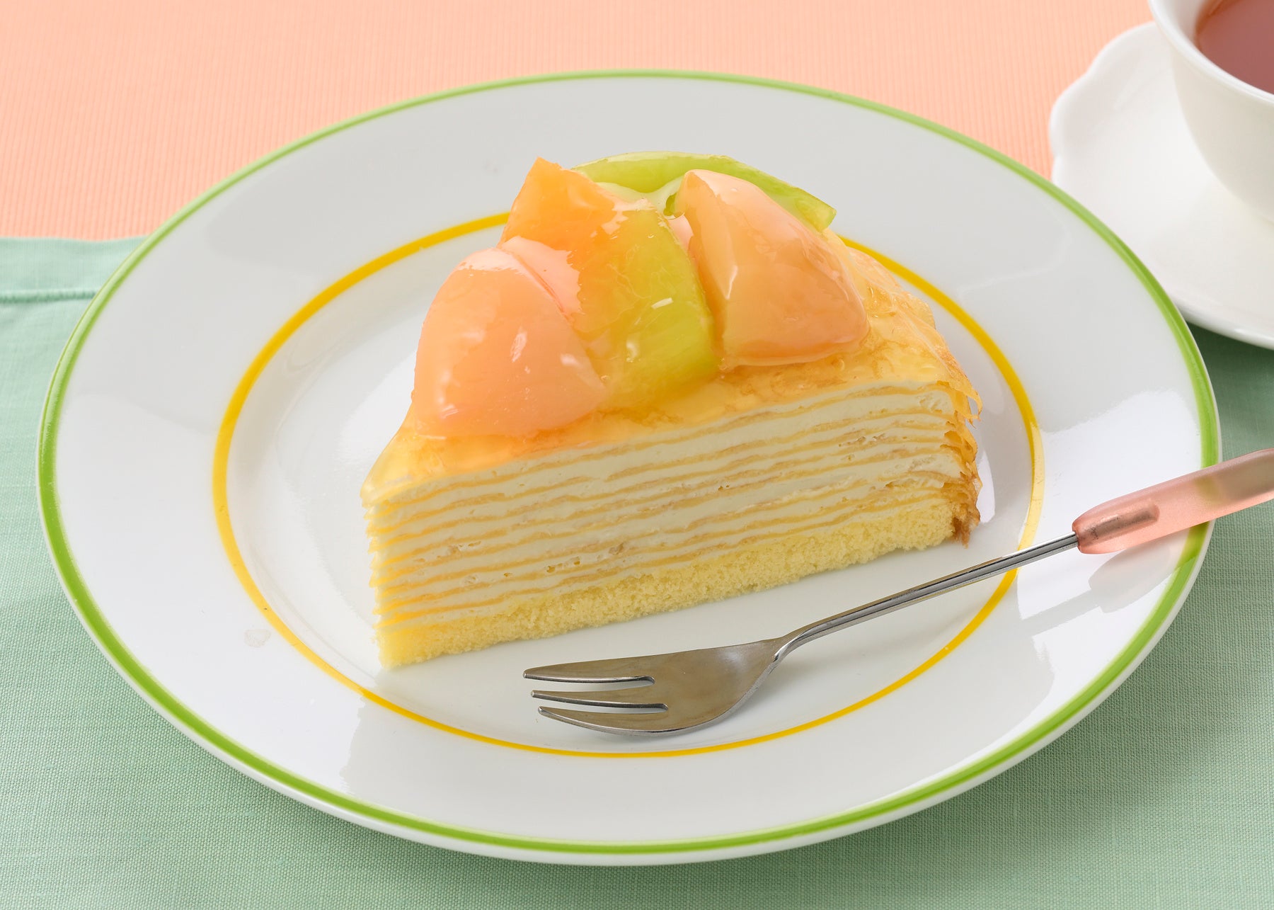 特長:コクのある甘みと芳醇な香りの「赤肉メロン」、爽やかな甘みと香りの「青肉メロン」、とろける食感の白桃を飾って仕上げたミルクレープです。