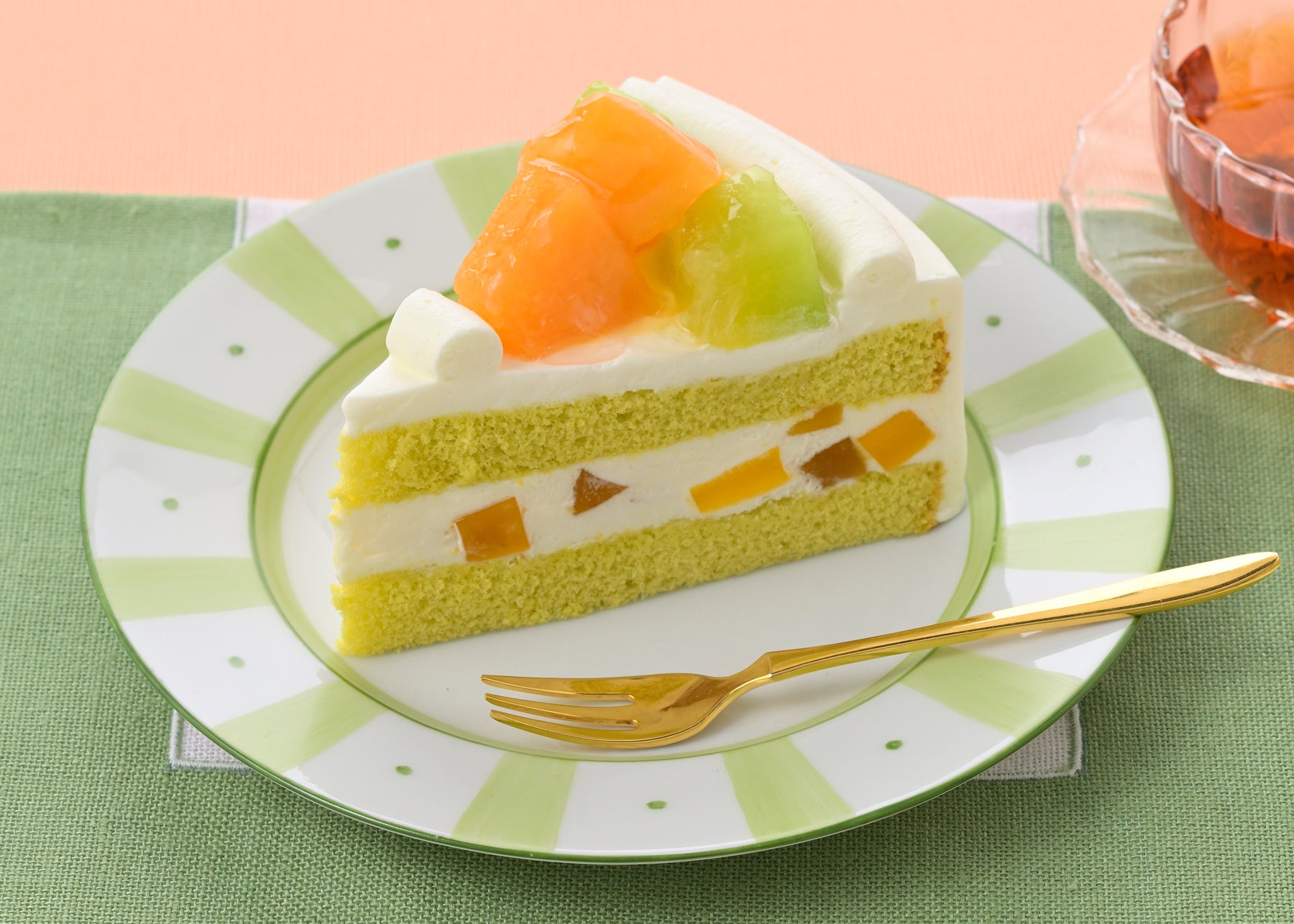 特長:コクのある甘みと芳醇な香りの「赤肉メロン」と、爽やかな甘みと香りの「青肉メロン」を贅沢に使った、季節限定のショートケーキです。