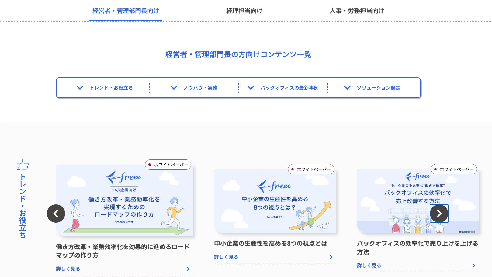 コンテンツの対象を「経営者・管理部門長」「経理担当者」「人事・労務担当」に分け、