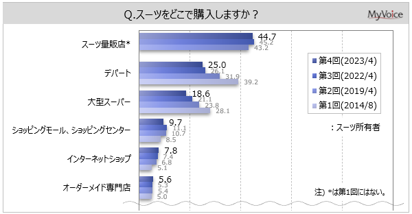 スーツの購入場所は(複数回答)、「スーツ量販店」が所有者の44.7%です。「デパート」(25.0%)、「大型スーパー」(18.6%)は、過去調査と比べて減少しています。