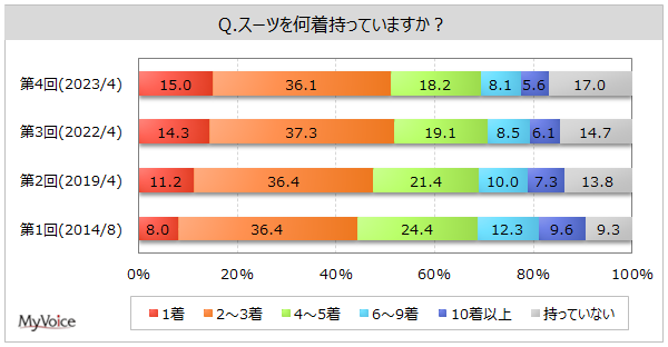 <今 回>(2023/4)https://myel.myvoice.jp/products/detail.php?product_id=29712 ※上記設問の他に、スーツの「購入頻度」「購入価格帯」なども聞いています。 <第3回>(2022/4)https://myel.myvoice.jp/products/detail.php?product_id=28511 <第2回>(2019/4)https://myel.myvoice.jp/products/detail.php?product_id=24911 |