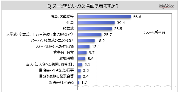 スーツを着る場面は(複数回答)、「法事、お葬式等」が所有者の56.6%、「仕事」「結婚式」が各4割弱、「入学式・卒業式、七五三等の行事やお祝いごと」が25.7%となっています。