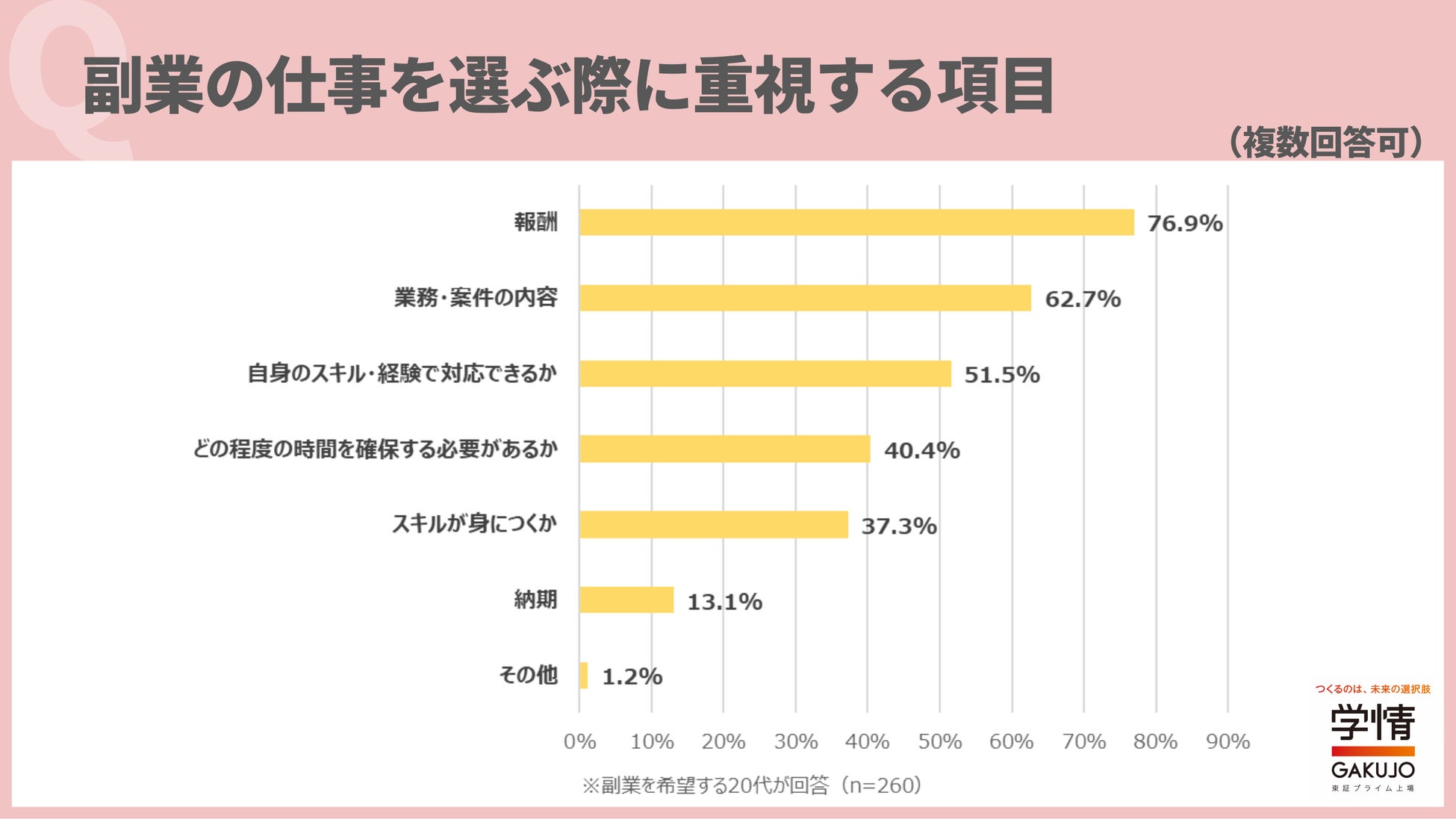 副業の仕事を選ぶ際に重視する項目は、「報酬」が76.9%で最多。次いで、「業務・案件の内容」62.7%、「自身のスキル・経験で対応できるか」51.5%が続きました。「収入を増やすことが目的なので、報酬を重視している」「本業としっかり両立できる範囲で取り組みたい」「学生時代に身に着けたスキルを活かした副業をしたい」といった声が上がっています。