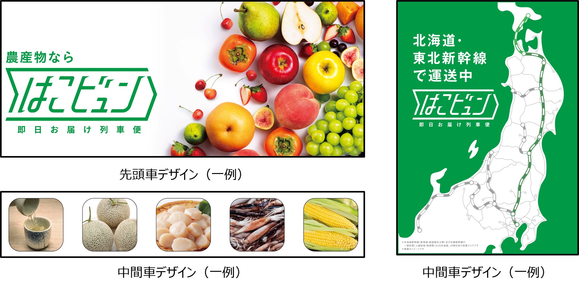 「はこビュン」が、当社の鉄道ネットワークを活かし、地域の商品・魅力をお届けするサービスであることを全面に出した荷物専用新幹線の特別デザインです。先頭車は代表的な輸送商材を大きくデザインし、中間車の窓にエリア毎の主に輸送実績のある地産品等をデザインしています。