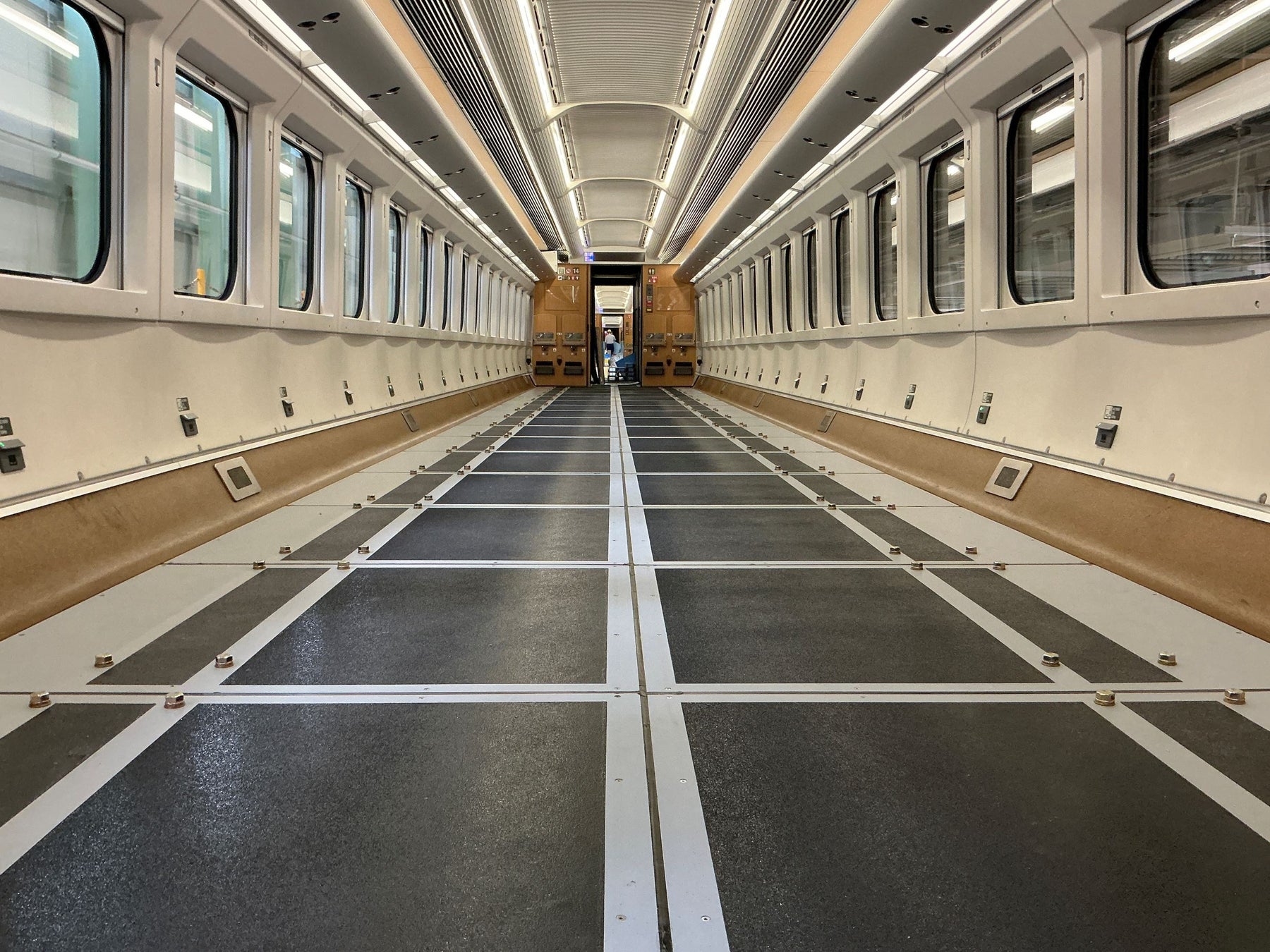 荷物搭載スペースを確保するため、客室内の座席を全て撤去しました。荷物をカゴ台車に載せたまま車内に搭載する為に、床面をフラット化した上で鉄板を敷き、滑り止め加工をしています。また、車内に設置したベルトで荷崩れを防止します。