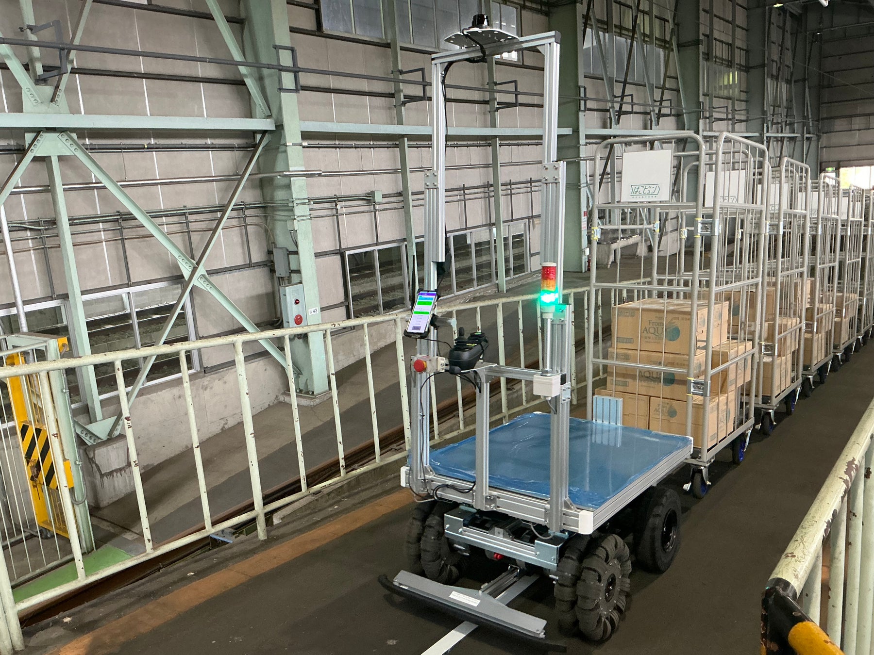 新幹線車両センター内での荷物の搬送に関し、AGVにより120サイズ(20kg相当)の箱約40個分まで牽引搬送し、車両センター内のスロープや狭小ルートも含め自動搬送を実現します。