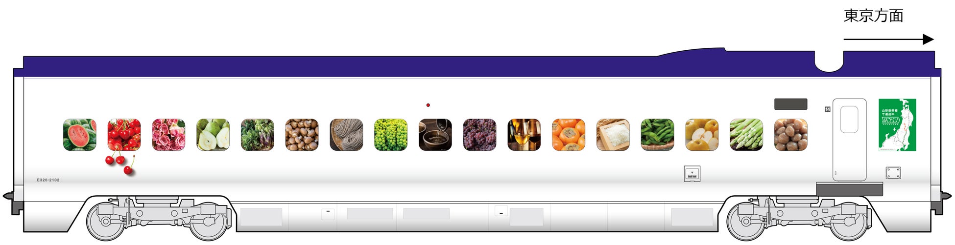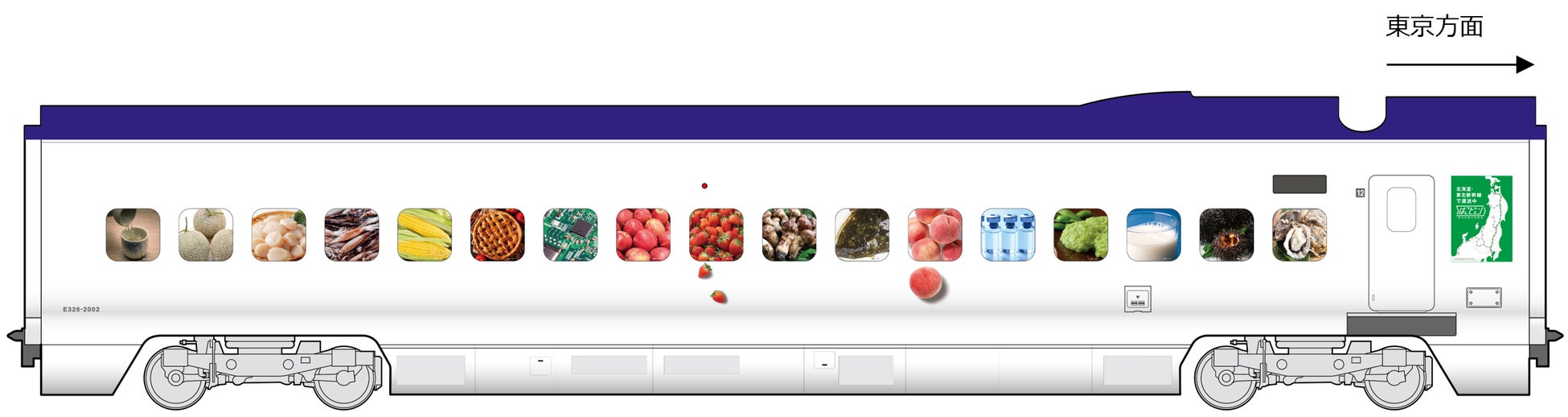 先頭車には代表する輸送品目を大きくラッピングし、中間車の窓には各新幹線エリアで輸送実績のある商材を中心に、地域の代表する産品等を合計80種類デザインしました。