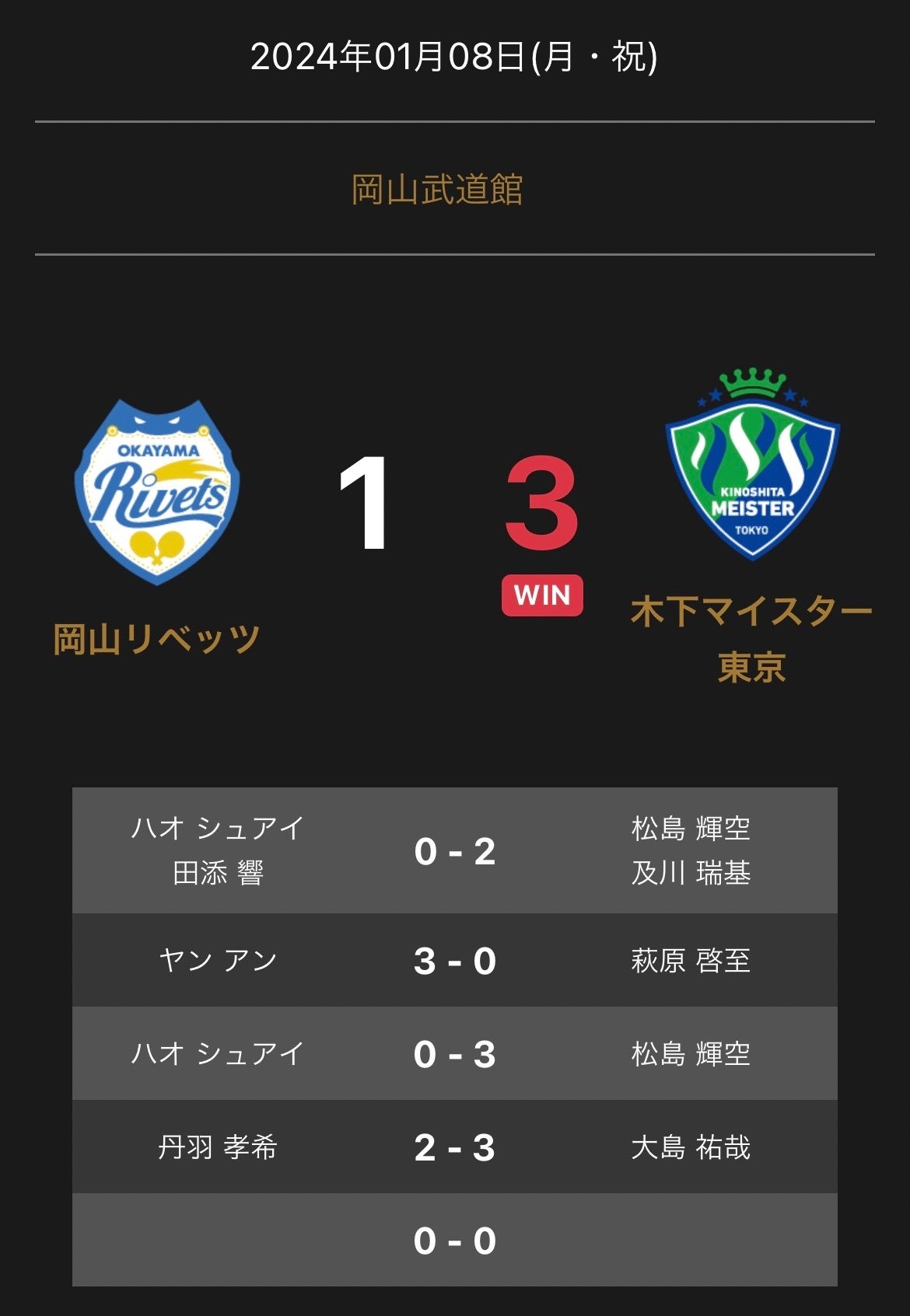 ノジマTリーグ 2023-2024シーズン 公式戦 1月8日開催「 岡山リベッツvs木下マイスター東京」の試合結果を発表いたします。
