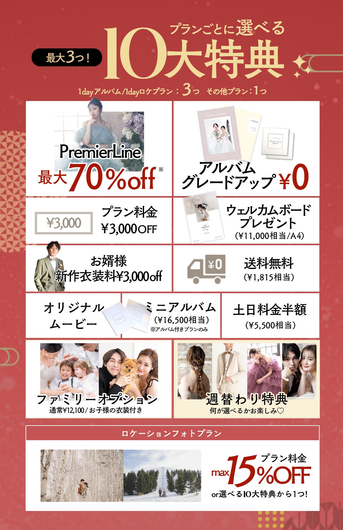 「データはたくさん欲しいけれど、アルバムも残したい」「お婿さんの衣装にもこだわりたい」。そんな多様なニーズに応えるため、最大3つまで選べる「10大特典」をご用意しました。