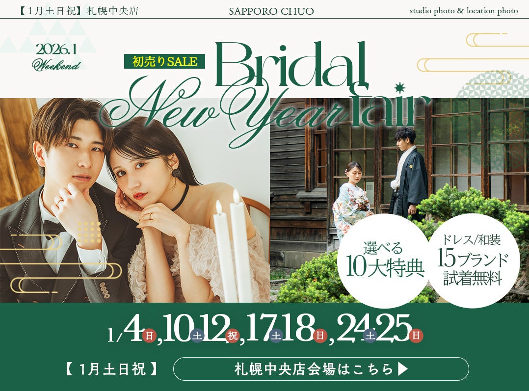 有限会社三景スタジオ(本社:北海道旭川市、代表取締役:大西康弘)が運営するフォトスタジオは、2026年1月の週末限定で「札幌ブライダルフェア」を開催します。JILL STUARTやISAMU MORITAなど、花嫁憧れの最新ブランドドレスが揃う試着会や、最大5万円相当の特典が選べる新春特別企画を実施。20代女性が求める「SNS映え」と「圧倒的なコストパフォーマンス」を両立した、新しいフォトウェディングの形を提案します。