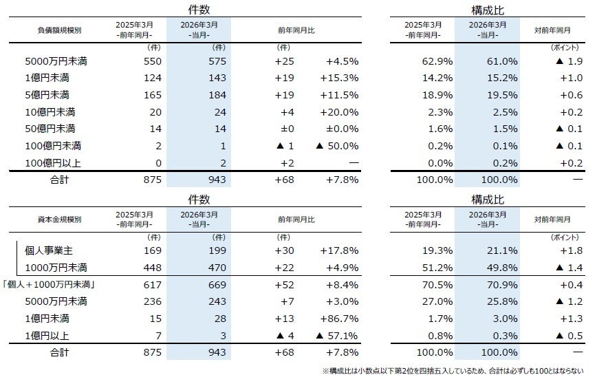 負債額を規模別にみると、「5000万円未満」が575件(前年同月550件、4.5%増)と7カ月連続で前年を上回り、3月としては2000年以降で最多となった。「5000万円以上1億円未満」は143件(同124件、15.3%増)と、4カ月連続で前年を上回った。