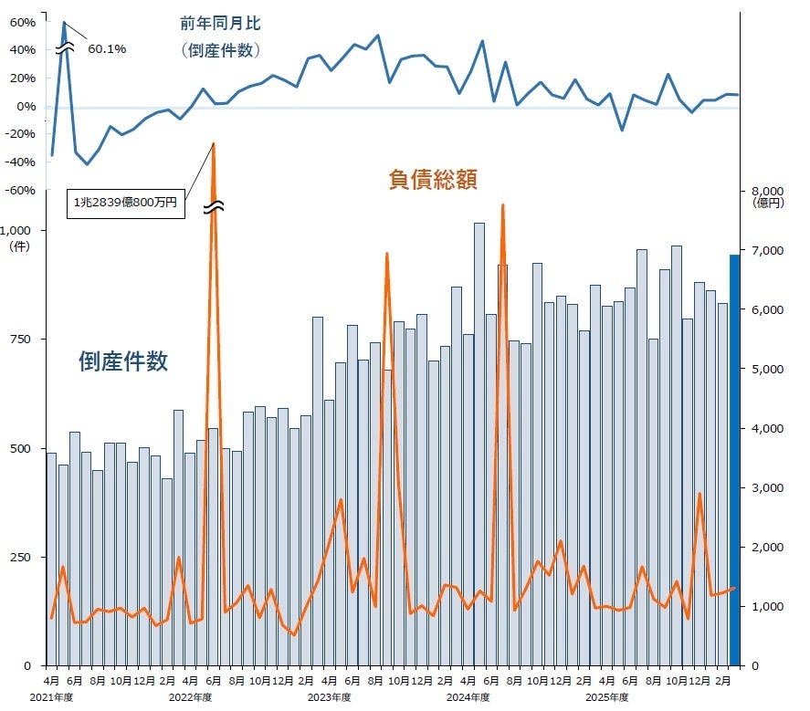 ■倒産件数は943件(前年同月875件、7.8%増)と4カ月連続で前年を上回り、2025年7月(956件)に次ぎ2025年度で3番目に多かった。単月として900件を超えるのは5カ月ぶり。3月としては、2012年(1040件)以来14年ぶりに900件超となった