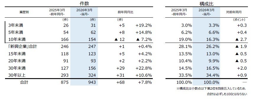 業歴別にみると、「30年以上」が324件(前年同月293件、10.6%増)で最も多く、2カ月連続で前年を上回り、3月としては過去10年で最多となった。次いで「30年未満」は156件(同127件、22.8%増)と、4カ月連続で前年を上回り、3月としては過去10年で最多となった。