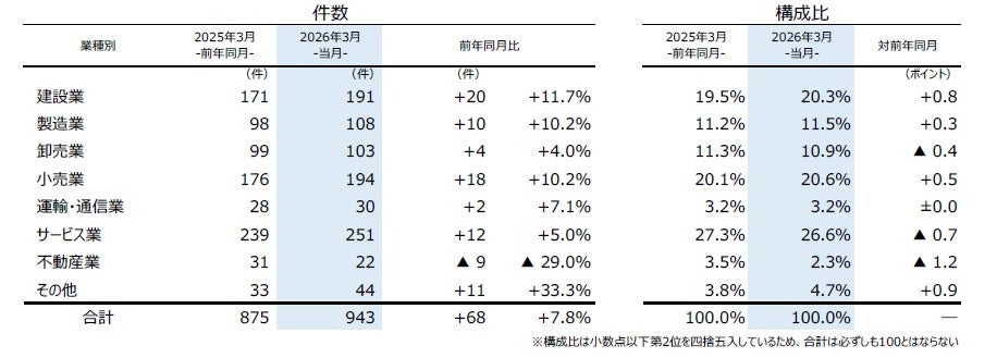 業種別にみると、7業種中6業種で前年を上回った。『サービス業』(前年同月239件→251件、5.0%増)が最も多く、2025年7月(263件)に次ぎ2000年以降で過去2番目に多かった。『小売業』(同176件→194件、10.2%増)は3カ月連続で前年を上回った。『建設業』(同171件→191件、11.7%増)は前年を上回り、2025年度で最多となった。『製造業』(同98件→108件、10.2%増)は2カ月ぶりに前年を上回り、3月としては過去10年で最も多かった。