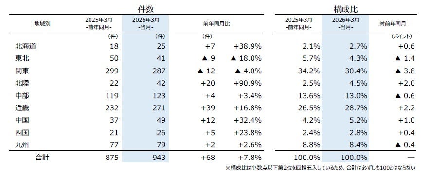 増減率でみると、『北陸』(前年同月22件→42件、90.9%増)がほぼ倍増となり、3月としては2000年以降で2番目に多かった。特に「新潟」(同8件→15件)や「石川」(同3件→12件)が全体を押し上げた。