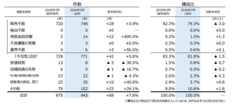 主因別にみると、「販売不振」が748件(前年同月720件、3.9%増)で、3カ月連続で前年を上回り、3月としては過去10年で最も多かった。この他、過去10年で最多となった「売掛金回収難」(前年同月2件→14件、600.0%増)などを含めた『不況型倒産』は771件(同729件、5.8%増)となり、全体の81.8%を占め、3カ月連続で前年を上回った。