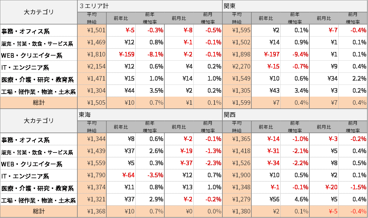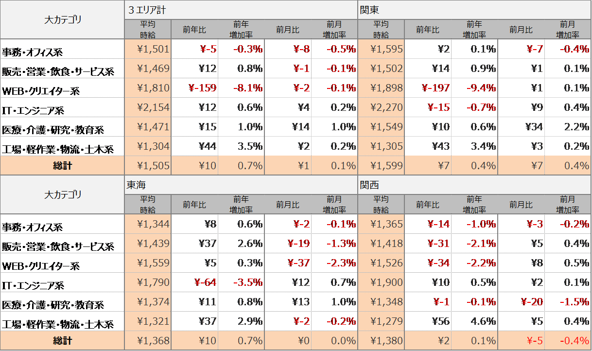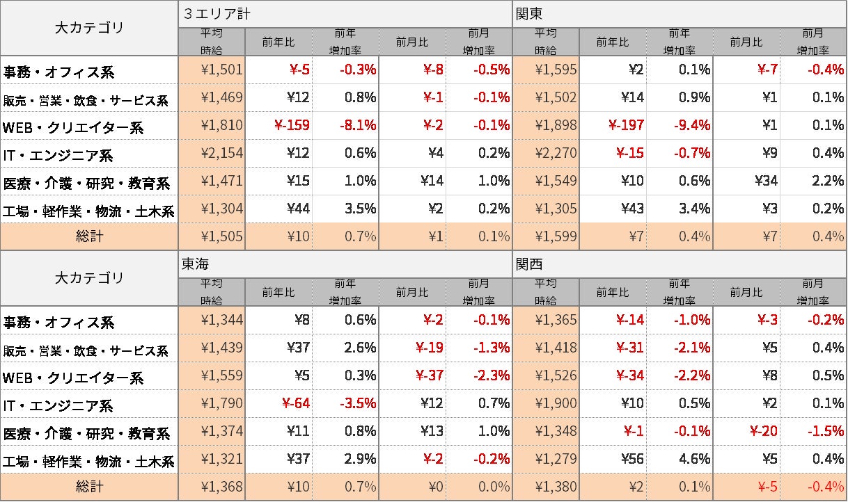 エリア別の平均時給について、関東エリアは1,599円(前年同月比+7円、前月比+7円)、東海エリアは1,368円(前年同月比+10円、前月比±0円)、関西エリアは1,380円(前年同月比+2円、前月比-5円)となりました。