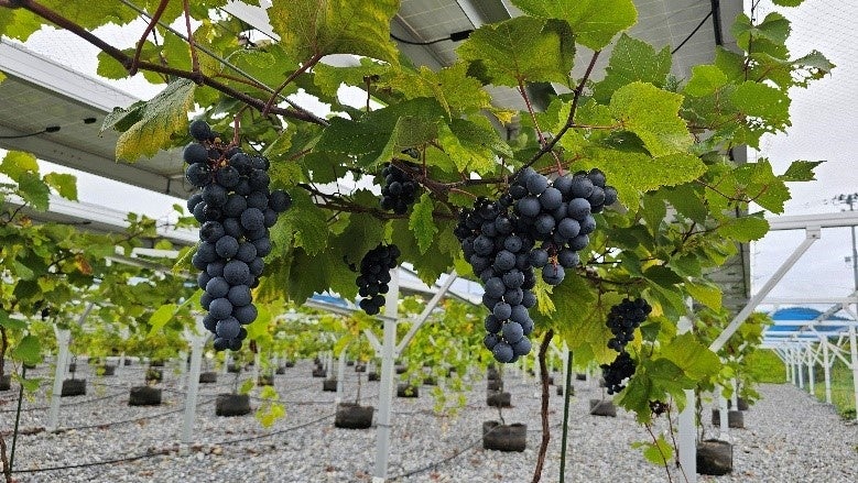 さらに独自の取り組みとして、太陽光を農地(ぶどう畑)とその上部空間を活用した太陽光発電で共有する「ソーラーシェアリング」を行っております。これにより発電された再生可能エネルギーを園内で消費するだけでなく、ソーラーパネル自体がぶどうの生育を阻害する雨を防ぐ雨除けとして、ぶどうの生育環境を整える役割を果たしています。