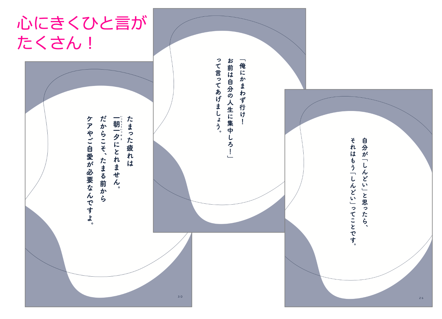 フォロワー数9万人の藤野智哉先生のX(旧Twitter)のような、ライトで時々くすっと笑える独特の名言に加えて、精神科医としての知見を織り込んだアドバイスで本文は構成されています。