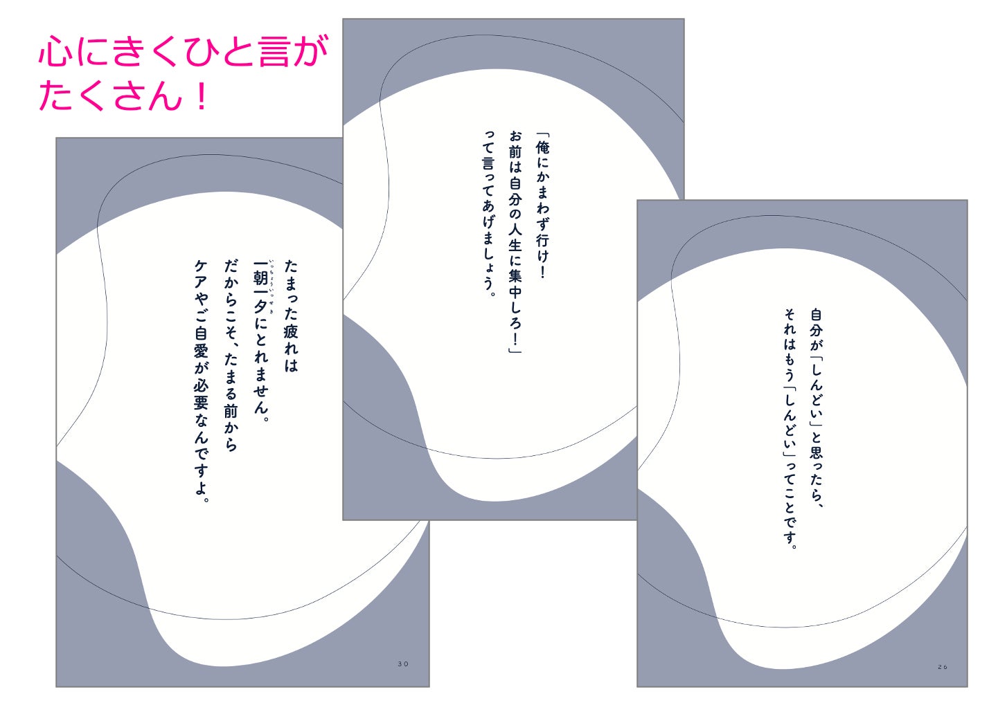 本書は、仕事で失敗したときや人間関係の悩みを抱えたとき、新しい環境にいるときに「このままじゃダメ」「変わらなきゃ」「ちゃんとしないと」とつい反省しがち、適応しすぎてしまう人に向けて、心がラクになり、自分らしく変化できるようになるメッセージがつまっています。