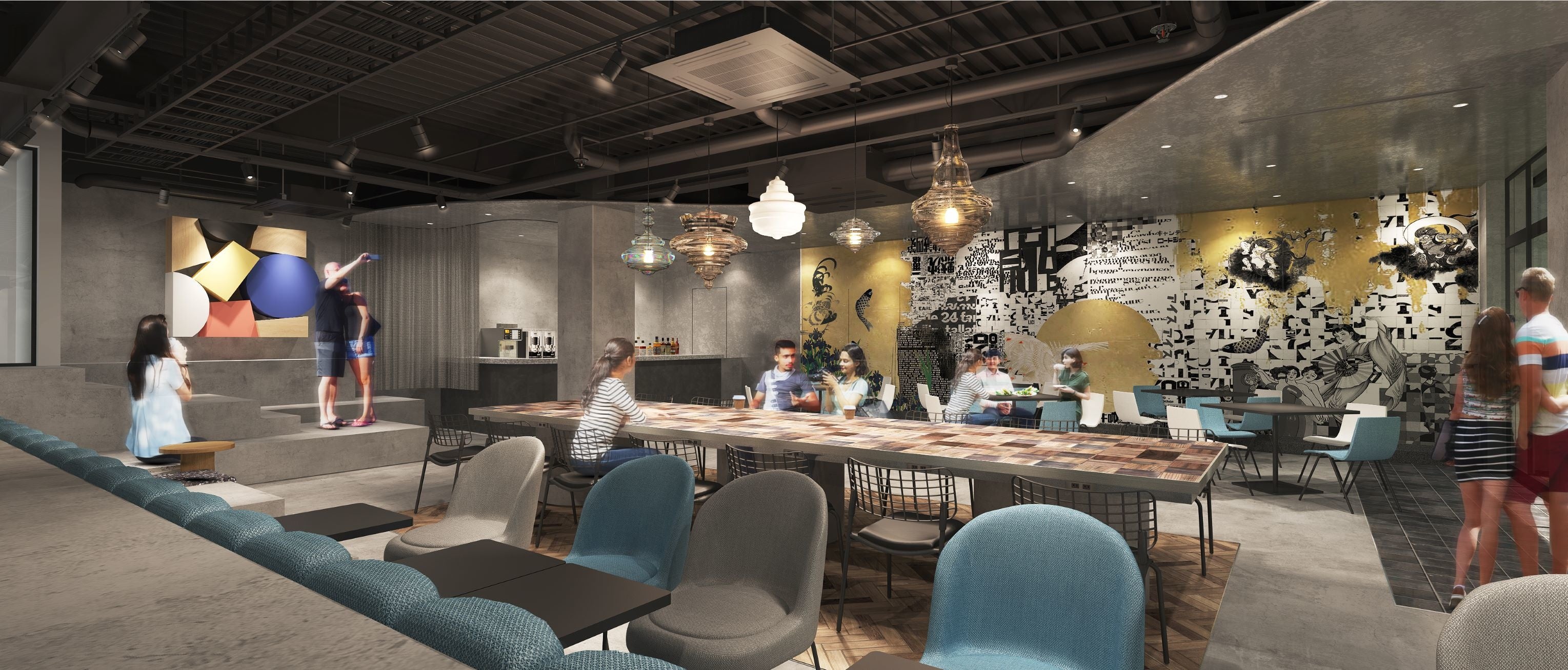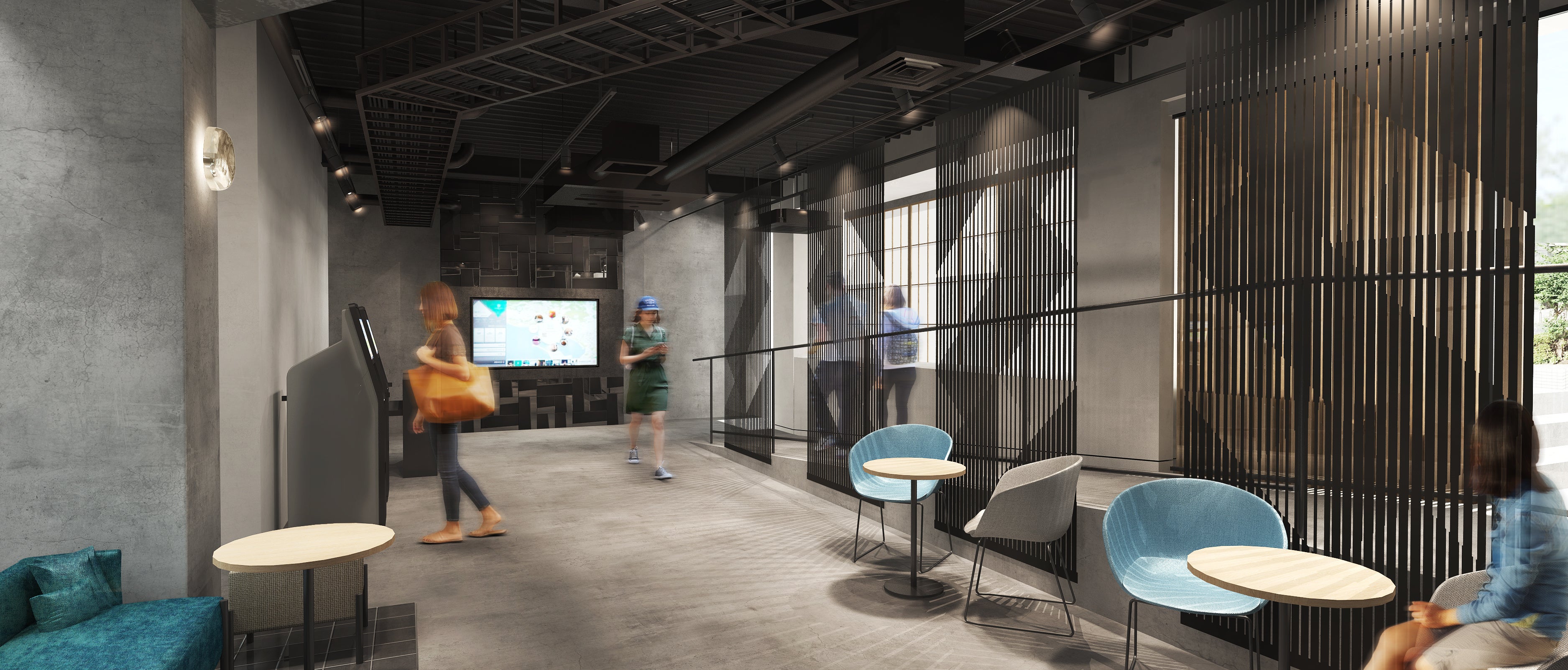 ホテルのエントランスからロビーにかけてはシームレスな空間をイメージし、ロビーエリア、チェックインエリア、レストランが一つの空間になるようにデザインをしています。お客さま同士の交流の場にもなるビックテーブルは製材から100年以上経過した古材を使用し、空間の中に温かさ、懐かしさを与えています。「三条の温故知新」をテーマに京都に所縁があるアーティストのコラージュと金箔で仕上げた壁面や、京都を守る東西南北4つの神(青龍、白虎、朱雀、玄武)をイメージした積木アート、鴨川の土手に見立てたステップシート等、京都をモチーフとしながらも、今までにはない特徴的なデザインがいたるところにちりばめられています。