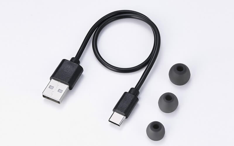 主な付属品:充電ケース、USB充電ケーブル(USB-A - USB Type-C(TM))、イヤーキャップ(S/M/L:各1個・Mは本体装着済)