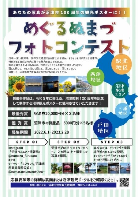 また同時に<めぐるぬまづフォトコンテスト>も実施。沼津の魅力を写真におさめて投稿する事で、令和5年に迎える、沼津市制100周年を記念して制作する沼津観光ポスターに使用されるチャンスも。最優秀賞は宿泊券。優秀賞には沼津の特産品がプレゼントされる。