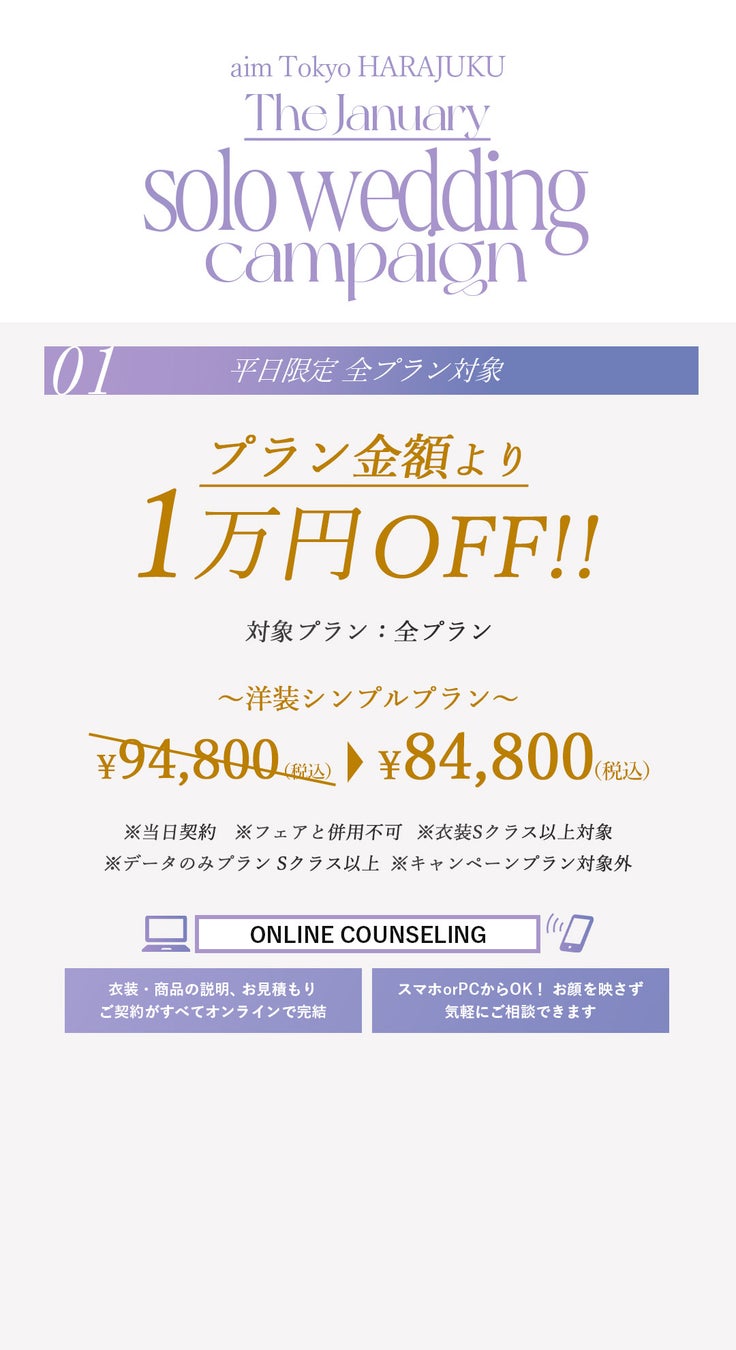 クリエイティブなコーディネート提案と圧倒的ビジュアルで人気のaim/aimme東京原宿店にて、お得に婚礼&ソロウェディング撮影、振袖&卒業袴レンタル/撮影が叶う平日限定キャンペーンを開催いたします。