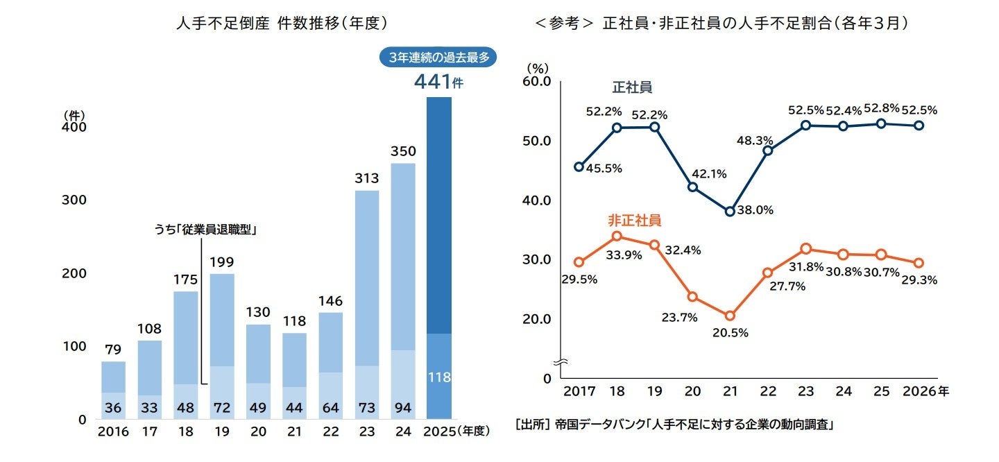 従業員の退職や採用難、人件費高騰などを原因とする人手不足倒産(法的整理、負債1000万円以上)は、2025年度に441件発生し、前年度(350件)から約1.3倍に増加した。年度ベースで初めて400件を超え、3年連続で過去最多を更新した。