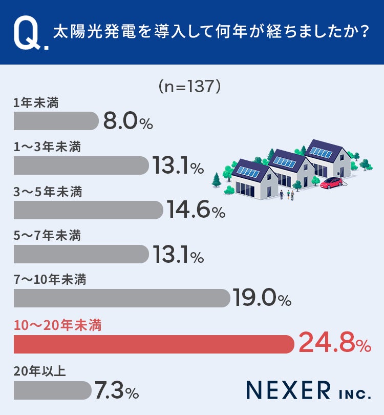 合計で32.1%の方が、太陽光発電を導入して「10年以上」が経過した、と回答しています。