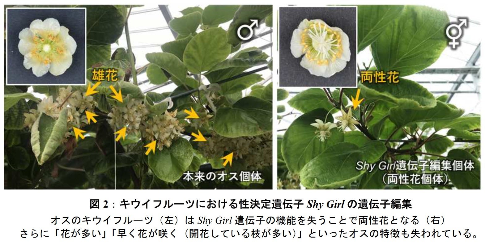 キウイフルーツのオスは花が多い・花が早く咲くといった「オスらしさ(オスに有利な特徴)」を有していますが、赤木研究教授らは、この特徴が従来の説のようにY染色体が作られる過程で生み出されたものではなく、性別決定遺伝子そのものが本来持つ機能であることを明らかにしました。これは、植物における性染色体の進化過程やその役割を世界で初めて明らかにしたものであると同時に、作物の性表現に関わる重要な知見として、食物の安定的生産や新しい育種を可能にする技術に発展していくと期待できます。