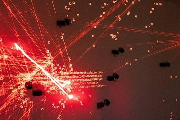 《Resistance Array》は、現代において情報がミームとして伝播する様子とそれによる連帯のあり方に着目した作品です。デモにおけるレーザーポインタの利用がSNSを通じて世界各地に広がった経緯を参照し、投稿されたテキストの内容と投稿同士の関連性を機械学習で分析し、ネットワーク化した結果が投影されます。また、本作品ではすずえりが近年取り組んでいる光に音声重畳を行う可視光通信の仕組みがレーザー光に応用され、レーザー光が受信機に当たった時だけ、音声がスピーカーから出力されます。