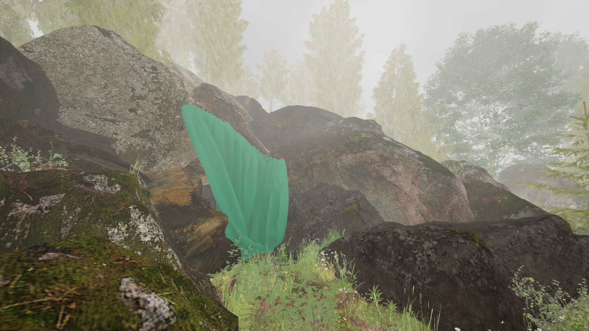 《LYMENA》は、CGのコウモリたちが生息する「立ち入ることのできない洞窟」と、その周囲に生じる瞑想的時間からなるインタラクティブな映像作品です。作者が完成させた3DCGのコウモリたちは、敢えて目の前から隠されています。それでも、プログラム上は確かに存在する彼らの気配は、小さな森の霧の中に漂います。姿を見ることができない何かとの間に関係を生み出すことや、立ち止まることの創造性について、作者は問いかけます。