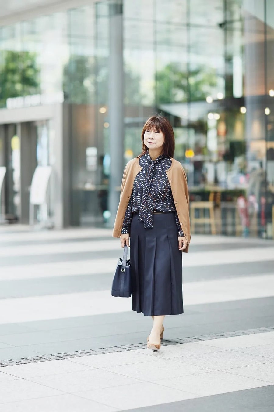 多色づかいのプリント柄も、細かい柄行のため品があり、通勤スタイルにもマッチ◎。胸元のボウタイは、さらっとひと結びしてシャープな印象に。生地のベースカラーに合わせて、ボトムもネイビーで統一するとスタイルアップ効果が期待できます。気温調節に活躍するカーディガンにはキャメルを選んで、少しずつ季節感を取り入れて。