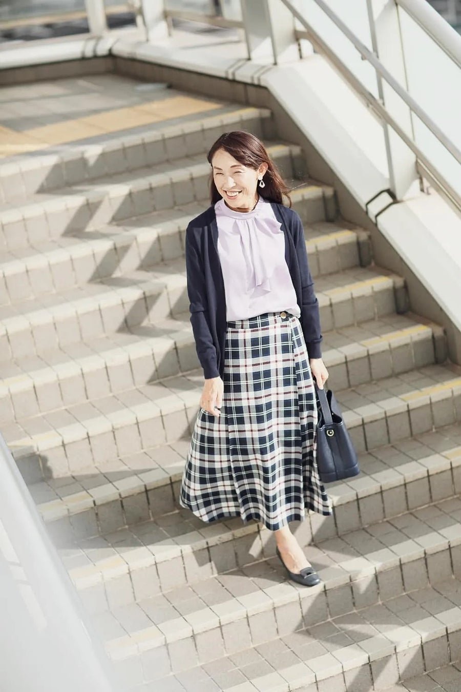 優しい印象のパープルのブラウスは、濃色コーデに取り入れるだけで顔周りを優しい印象に導いてくれます。柔らかく薄手の生地のためカーディガンなど、羽織りアイテムとも好相性◎。長め丈のニューヨーカータータンスカートと合わせて、エレガントな通勤スタイルに。