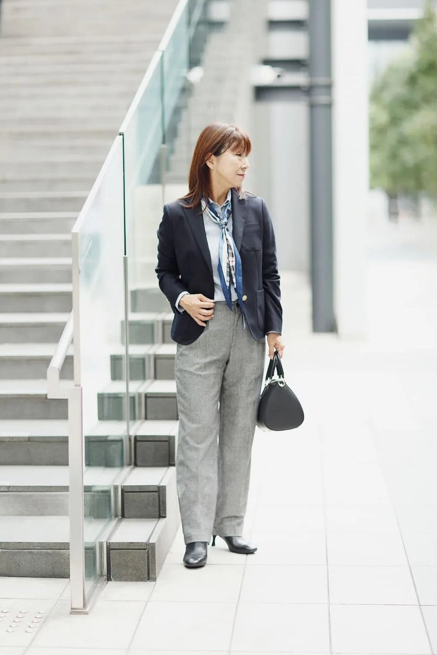 ロンドンストライプのブラウスは、トラディショナルにシングルブレザー合わせで。ボトムには、秋冬らしいホームスパン生地のパンツを選べば、ハンサムな通勤スタイルに仕上がります。胸元に菱形のスカーフを巻いてツヤ感を取り入れて、マニッシュになり過ぎないひと工夫を。