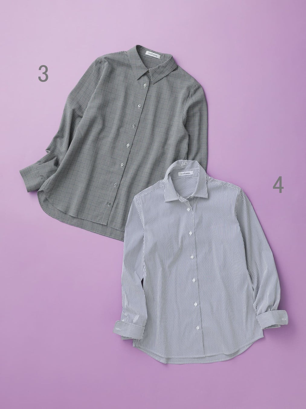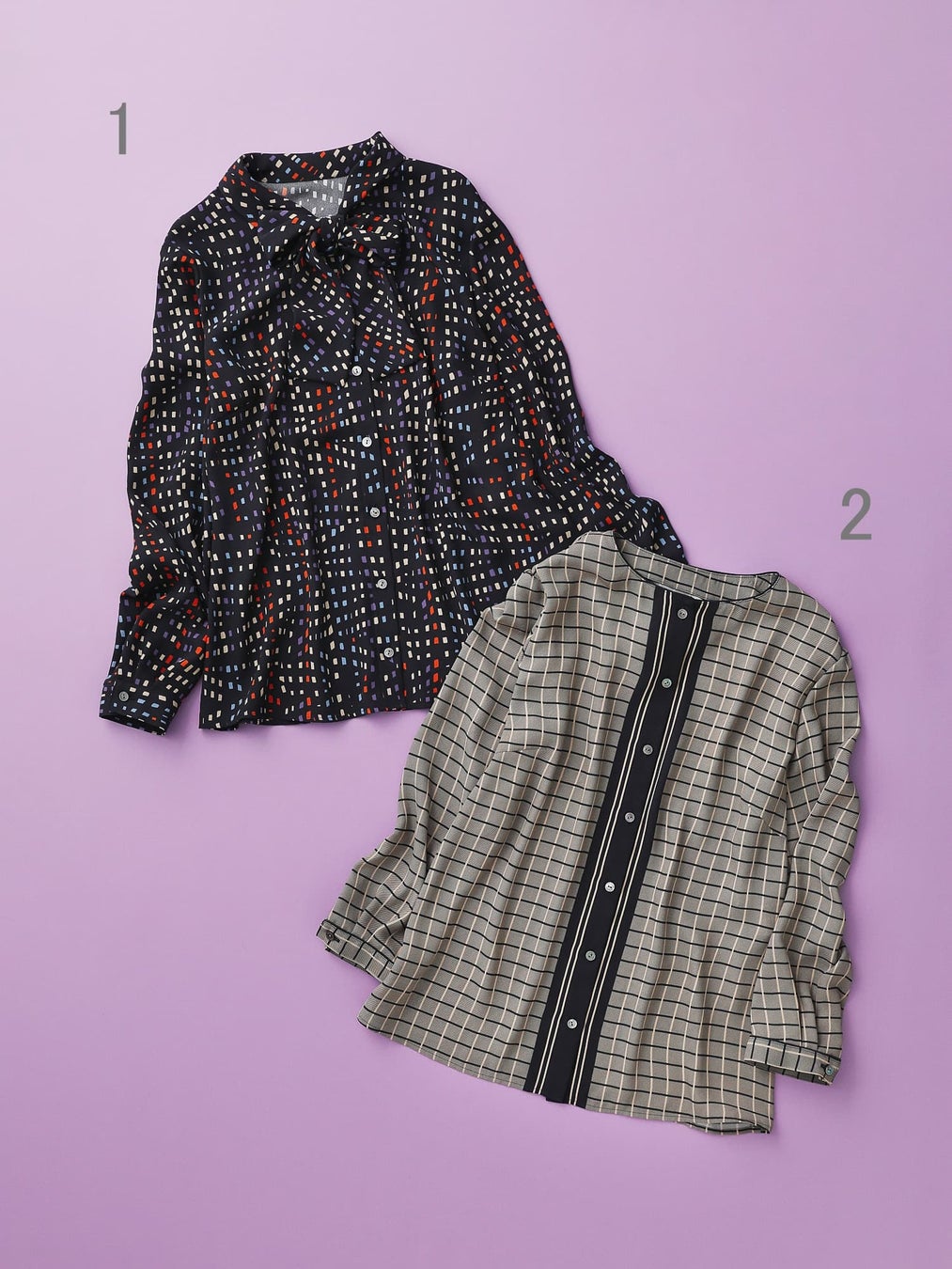3.ベーシックなデザインにレトロなチェック柄が映える長袖ブラウス。細かい柄行でコーディネートしやすく、オンオフ兼用で活躍します。