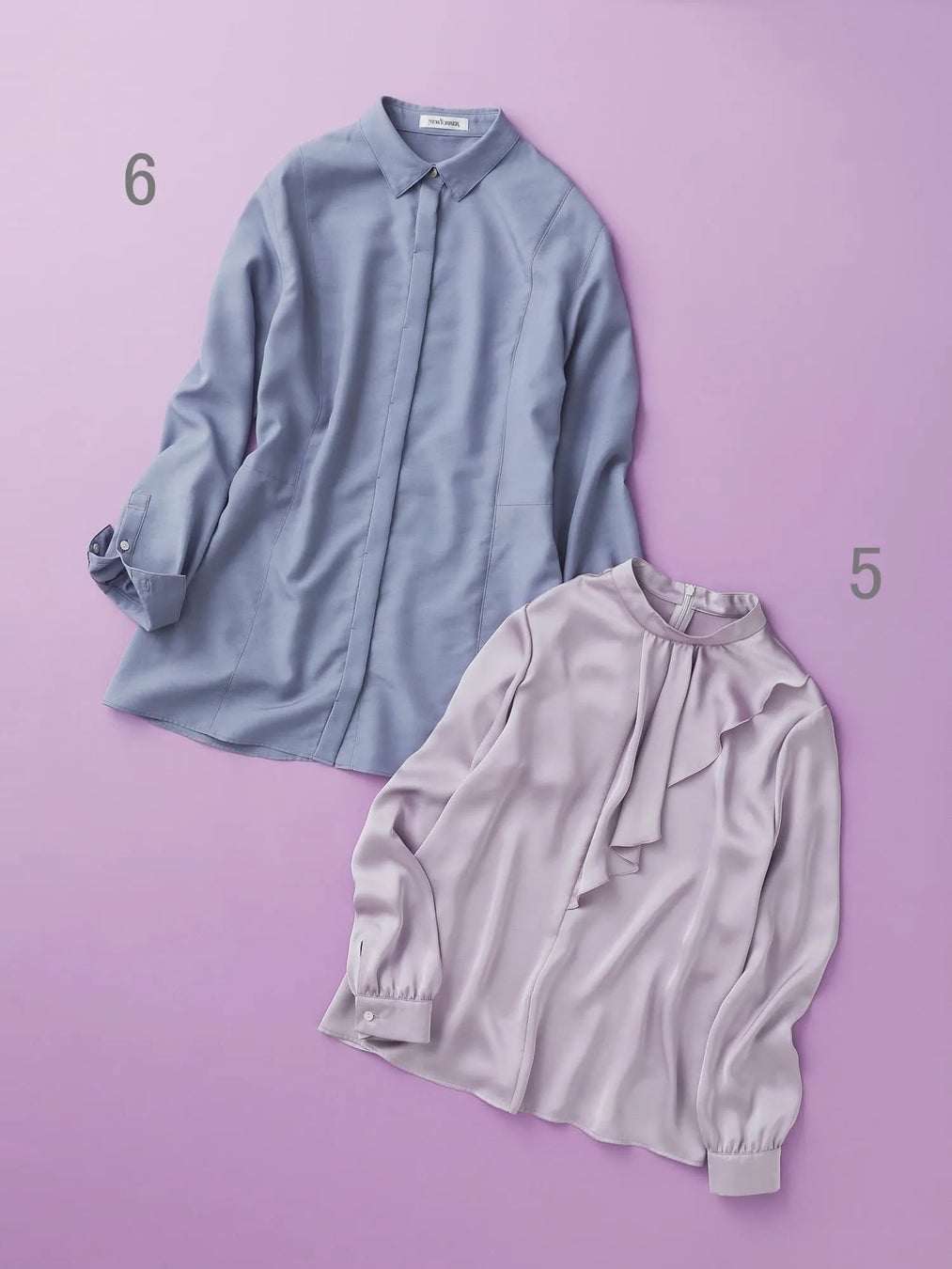 5.流れるようなフリルデザインが映える、エレガントな佇まいの淡いパープルのブラウス。1枚でも着映えのする華やかなデザインが魅力です。