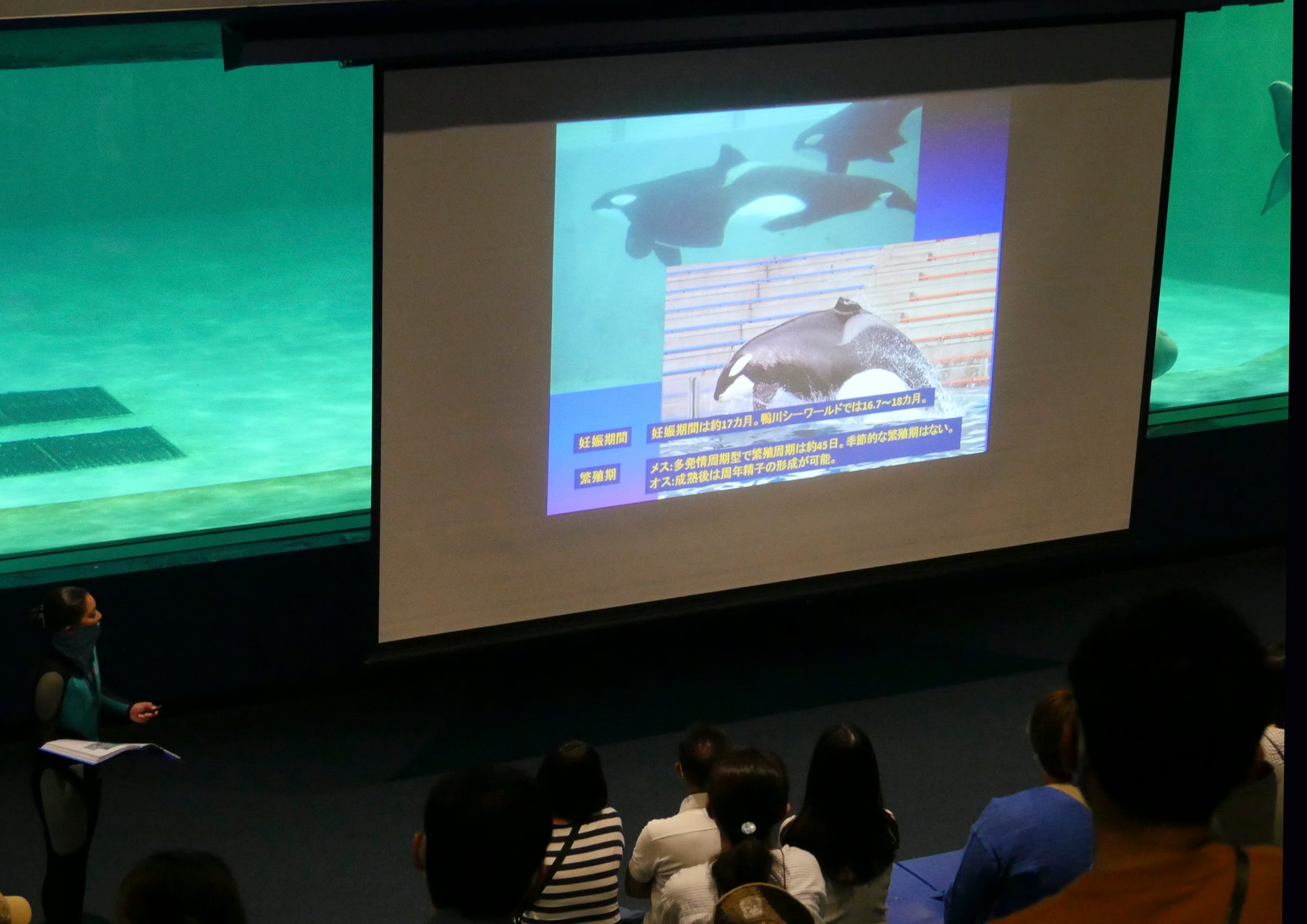 鴨川シーワールドでは、1970年10月の開業時よりシャチを飼育し、シャチパフォーマンスを公開してきました。1998年には日本で初めて繁殖に成功し、2008年には、日本で初めて生まれ育ったシャチ「ラビー」による3世の出産に成功しました。今回の特別レクチャー「シャチものしり講座」では、飼育現場における貴重な写真や映像を使いトレーナーがシャチについて詳しく解説します。