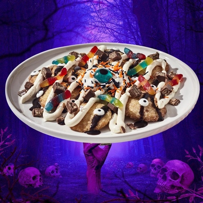 サクサクなクッキーの上に、濃厚でクリーミーなクリームチーズソースとチョコソースを盛り付け、カラフルなグミとクリスピーなチョコをトッピング。見た目にも楽しいハロウィン特別デザート!