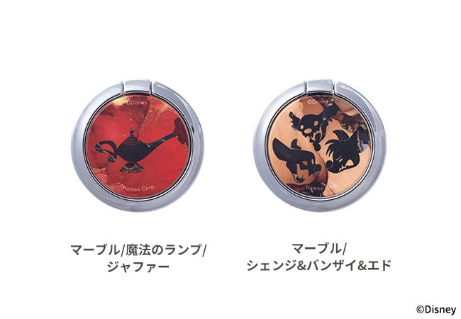 「iFace Finger Ring Holder フラットタイプ」は、暗く禍々しい深淵をイメージした黒のマーブル模様に「アースラ」・「マレフィセント」「イービル・クイーン」・「ジャファー」・「スカー」とお馴染みの手下キャラクターやキーアイテムが描かれたデザインです。