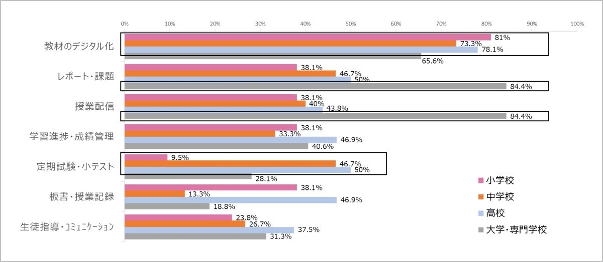 小学校は教材DX(81%)、大学は課題・授業配信DX(84.4%) が先行