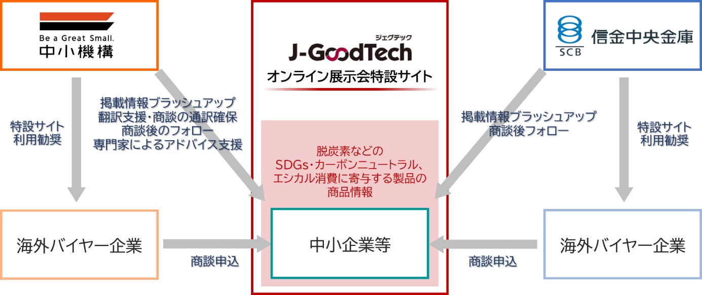 具体的には、中小機構が運営し、約33,000社が登録するビジネスマッチングサイト「J-GoodTech(ジェグテック)」内に、SDGs・カーボンニュートラル、エシカル消費に寄与する製品を紹介するオンライン展示会特設サイトを開設します。SDGs・カーボンニュートラル、エシカル分野の製品販売ニーズのある中小企業等を、中小機構や信金中金がリレーションを有する海外バイヤーとマッチングさせることで、海外への販路開拓をサポートいたします。