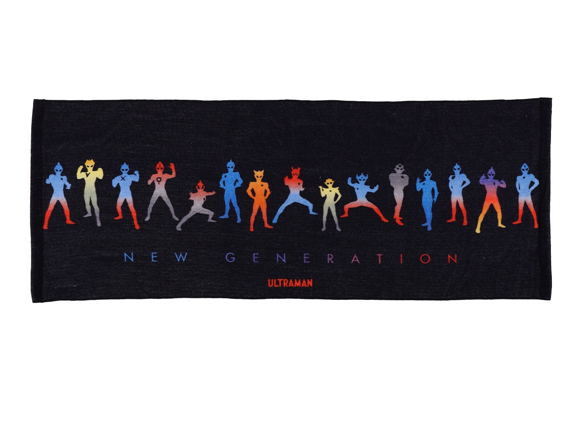 それぞれのヒーローのボディカラーやカラータイマーの色から着想を得たグラデーションを背景に、ニュージェネレーションヒーローズのシルエットをデザインしたミニタオル。