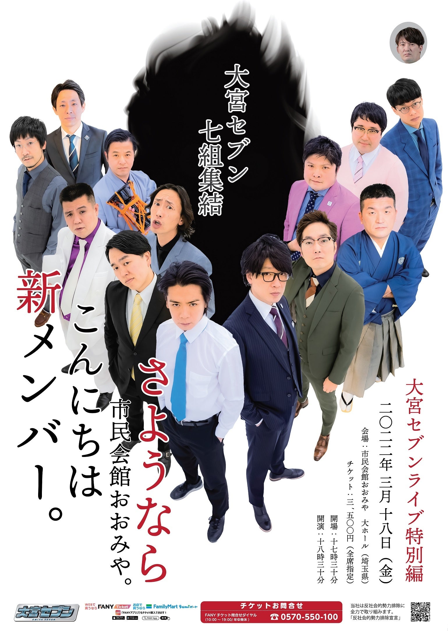 本イベントは、人気芸人ユニット大宮セブン(囲碁将棋/マヂカルラブリー/GAG/すゑひろがりず/タモンズ/ジェラードン(アタック西本、かみちぃ)によるイベントとなり、当日は大宮セブンメンバーのネタ披露だけでなく、大宮セブンの新メンバー発表などを行う予定です。そんな大注目の本イベントの公演ビジュアルが解禁!果たして大宮セブン7組目の芸人は誰になるのか。チケットは一般発売中。日々進化する大宮セブンにぜひご期待ください。