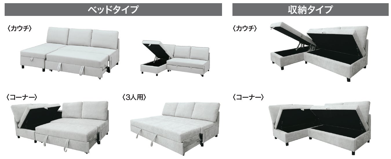 「ベッドタイプ」は、カウチソファのほかにコーナーソファ、3人用ソファからお好きなタイプをお選びいただけます。